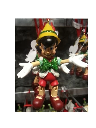 fully-sculptured Pinocchio Ornament, with bendable legs, and wearing a sparkling green bow. He is sure to bring many smiles