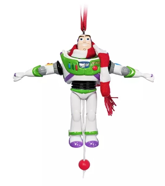 Even Space Rangers get cold. Buzz Lightyear wraps up for the holidays in his festive red and white scarf on this fun ornament. Pull down on the string to see Buzz’s arms and legs rise up!